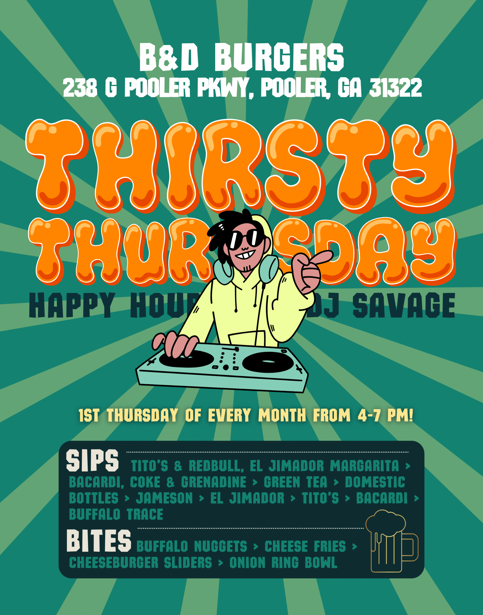 Calendar Add to Calendar Add to Timely Calendar Add to Google Add to Outlook Add to Apple Calendar Add to other calendar Export to XML When: 02/06/2025 @ 4:00 pm β 7:00 pm Repeats 2025-02-06T16:00:00-05:00 2025-02-06T19:00:00-05:00 Where: B&D Burgers Pooler 238 Pooler Parkway Ste G Pooler GA 31322 Cost: Free